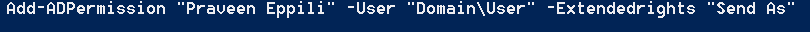 Now this Add-ADPermission cmdlet to manage Send As permissions for a mailbox. Here you must also specify the Send As permission with the ExtendedRights parameter. For example, to add the Send As permission to Exchange\praku on the user mailbox Praveen Eppili, need to use the above command.