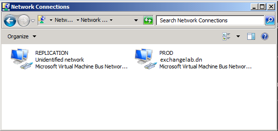 As already mentioned, two NICs have been installed in each server. Let us look at the way each NIC has been configured. To do so, open Network Connections. Here we have the NICs listed, and as you can see we have a PROD (connecting to the production network and providing MAPI connectivity) and a REPLICATION (connected to an isolated network) interface.