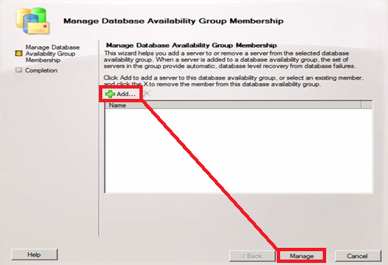 This opens the Manage Database Availability Group Membership wizard, where we click Add.
