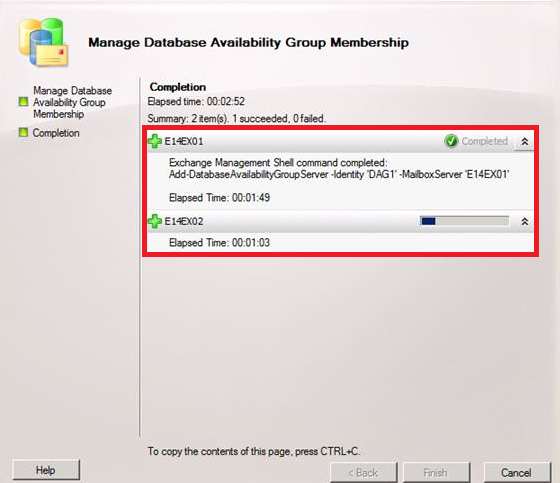 The failover clustering component will now be installed on each server. Then the DAG will be created and configured accordingly. This can take several minutes based on your Network.
