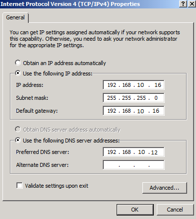 Open the property page of Internet Protocol Version 4 (TCP/IPv4). Here we have a static IP address configured as well as the other necessary settings (default gateway, subnet mask, and DNS server).