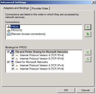 Now that we have configured each NIC, we must make sure the “PROD” NIC is listed first on the binding order list. To bring up the binding order list, you must press the ALT key, and then select Advanced > Advanced Settings.