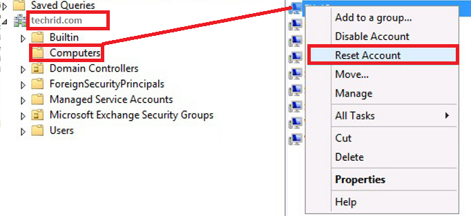 In brief open the AD Users & Computers navigate to Computers, on the right side on the Computer account (EX-15), right click and click Reset Account as shown below: