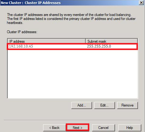 Add the IP address you wish to associate with the WNLB array. Remember this should be the same IP address that you also specified when you created the DNS record (client.techrid.com.com) for the CAS array. When the IP address has been added, click Next.