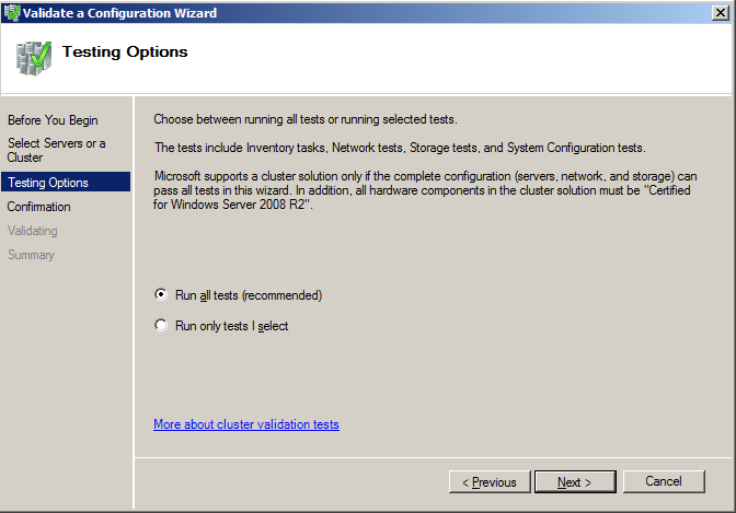 Note: You can also use the Failover Clustering Windows PowerShell command, Test-Cluster, to validate your cluster.