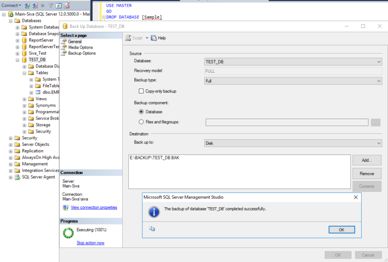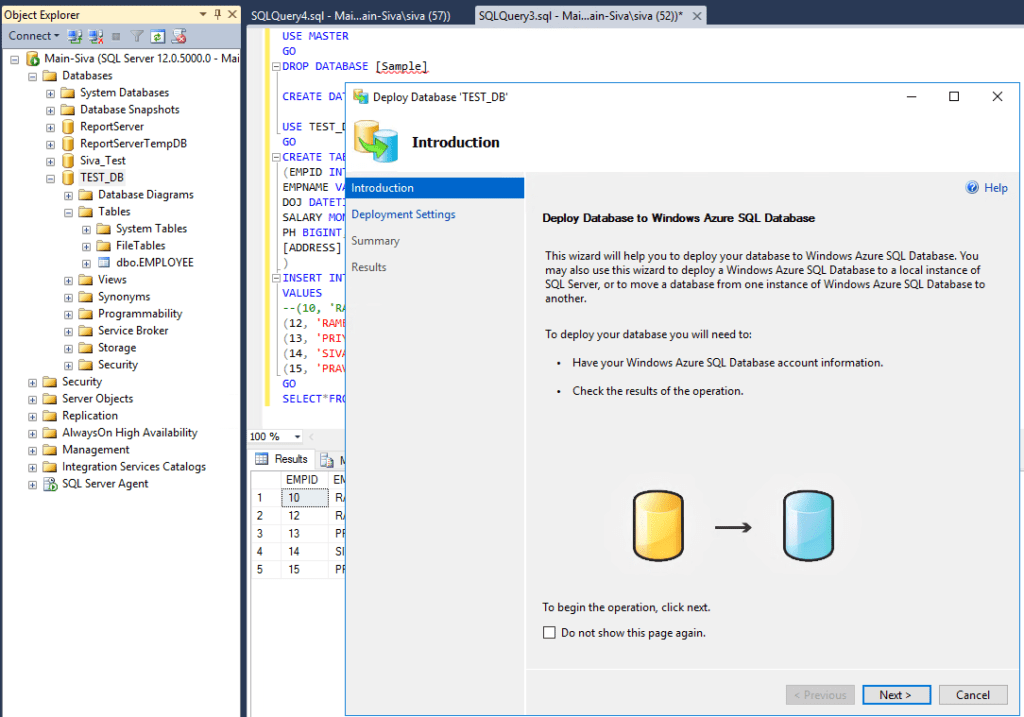 Here we have created SQL DB “Sample”. First we will delete and then we will proceed creating New Database and move the same to MS Azure